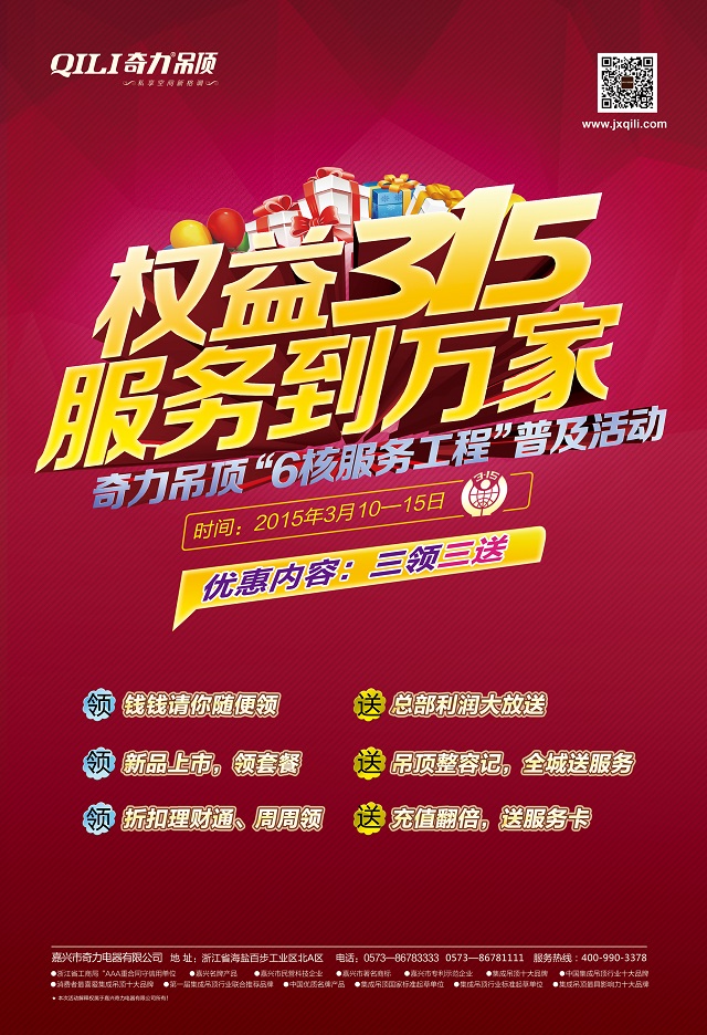 2015年3月15日,奇力吊頂,集成吊頂行業(yè)客廳吊頂領導者,暖風電器領導者,國家與行業(yè)標準起草單位,在消費者權益保護日這年度最重要的日子里,旗幟鮮明的推出了全國聯(lián)動的“權益315 服務到萬家——奇力吊頂“6核服務工程”普及活動,領袖,必定承擔超越同行的責任!