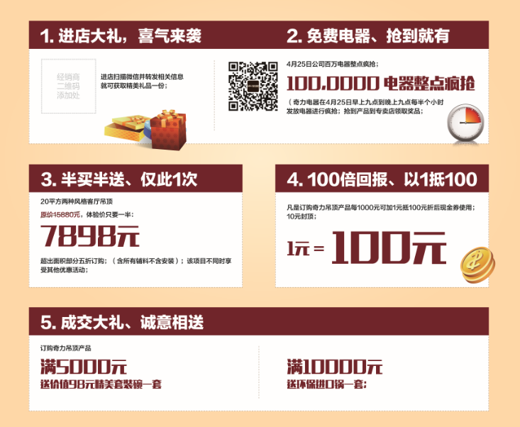 免費(fèi)電器整點(diǎn)瘋搶。4月25日 09:00 -21:00 奇力吊頂微信公眾號(hào)定時(shí)發(fā)布電器免費(fèi)禮券。搶到免費(fèi)禮券即可到奇力專賣店兌換。活動(dòng)當(dāng)天進(jìn)入 奇力吊頂 公眾號(hào),發(fā)送 禮物 二字即可參與免費(fèi)電器禮券活動(dòng)。