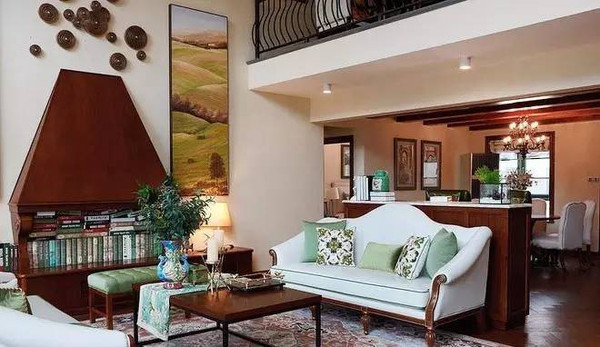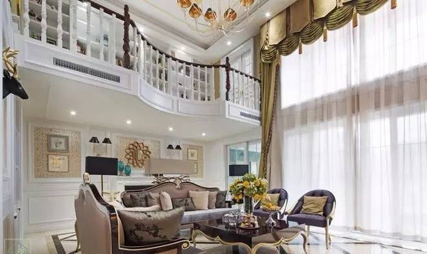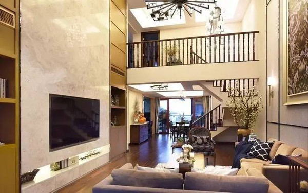 ③除此之外,挑空型客廳里的裝飾和配飾也是非常重要的一點了,可以嘗試在墻壁上掛上符合整體風(fēng)格的掛畫,或者是根據(jù)設(shè)計師的建議安裝幾盞造型獨特的壁燈,這些裝飾一烘托,整個客廳就更加大氣了。