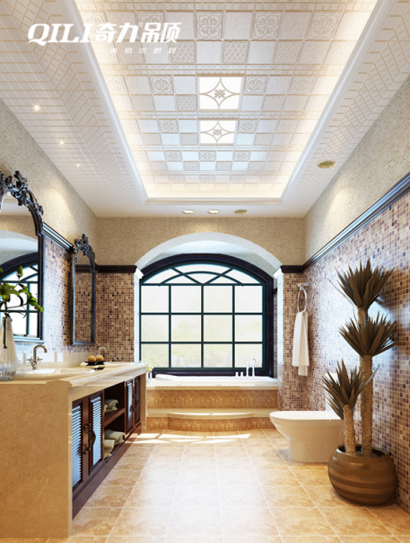 淺色似乎更符合現(xiàn)代人對于簡潔生活追求的心理特點,淺色系的扣板色調(diào)清新淡雅,一扇和煦陽光灑落在地上,整個衛(wèi)浴空間柔和至極。
