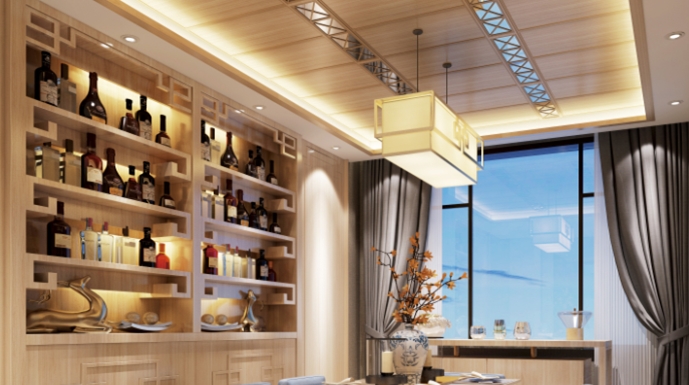 現代感十足的吊頂設計、扣板上簡潔的圖案,更是給人以視覺上的完美享受。這種極簡風格的餐廳設計更適合快節(jié)奏的生活。