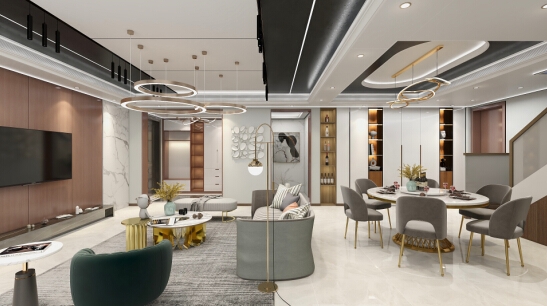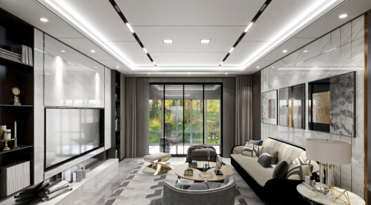在這個(gè)客廳里,頂墻地以黑白灰來配色,定調(diào)整體統(tǒng)一性,在視覺上達(dá)到相對(duì)的“一致性”,這樣的空間真的高級(jí)感十足。